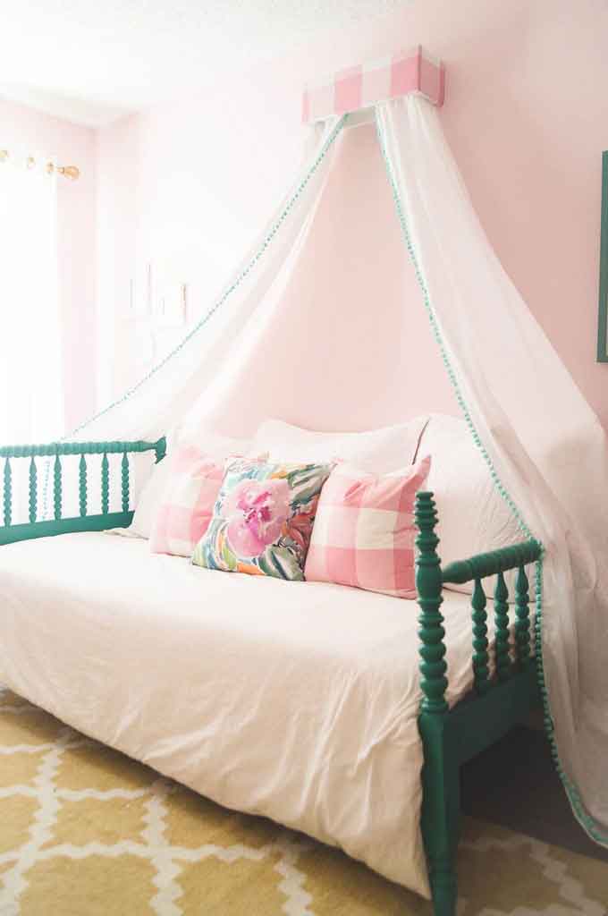 Wall Mounted bed canopy can be designed with this look. If you are interested in this idea, you need to pay attention to several things such as other colors, solid-colored fabrics, and solid-colored poles. You can use white as a base by combining other solid colors like brown, dusty pink, cream, and other solid colors. You can also change the wall color to white with natural wood floor coverings that add a soft impression.
