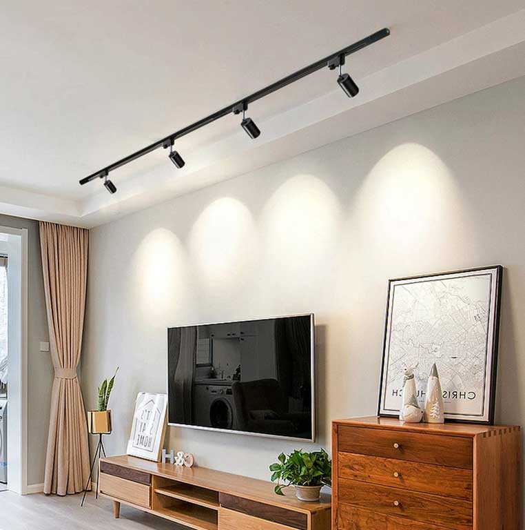 Modern and minimalist spaces, like an open loft or new development, can be warmed up with terrain characters. You can also add layers of plush materials, and artful accessories for your home decor. You can choose an edgy vibe alive with an avant-garde mirror and a low-to-the-ground chrome coffee table and add extra ceiling lights for living room in sleek black spotlights design.