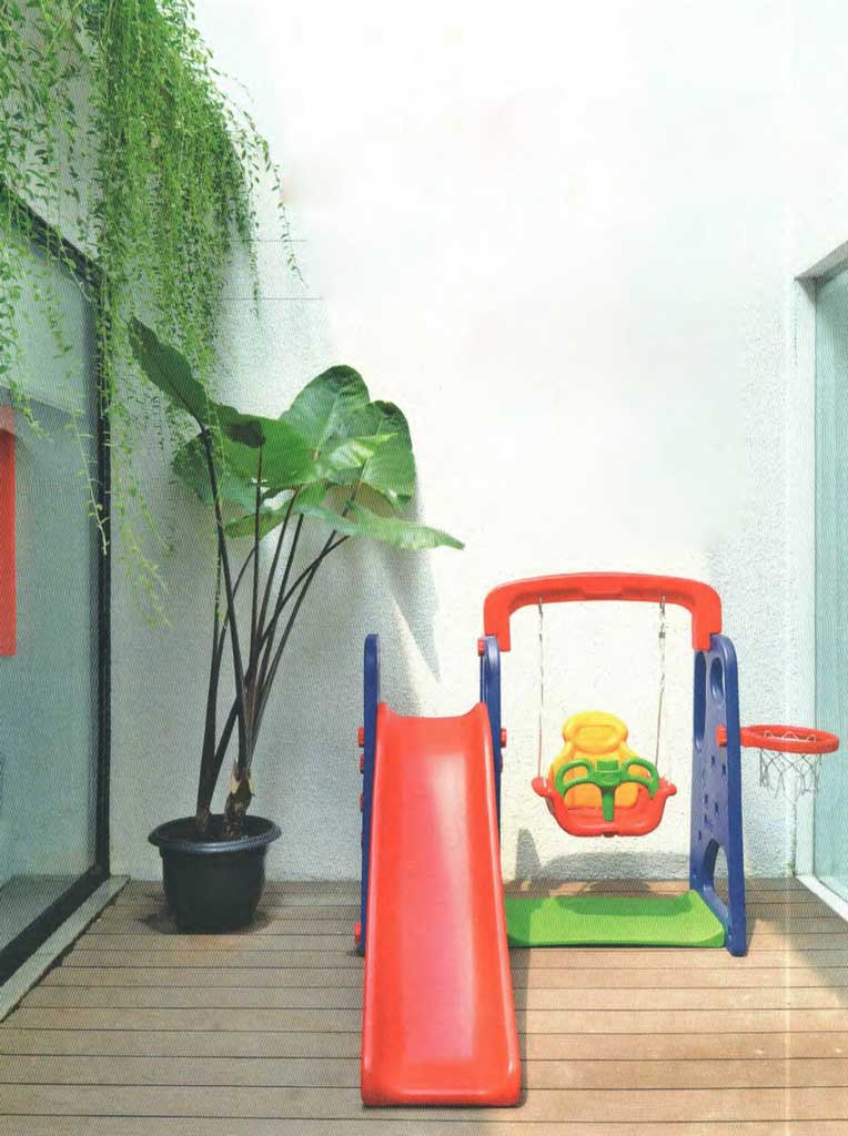 Instead of just being used to pass by, the terrace in the middle of the house can be used as a playground for children. Just put 1 or 2 game rides. To reduce heat on the floor, you can use a wooden deck. To make a fresh atmosphere, add plants, can be planted in pots or vines. With a pleasant and cool atmosphere, children will feel at home spending their time there.