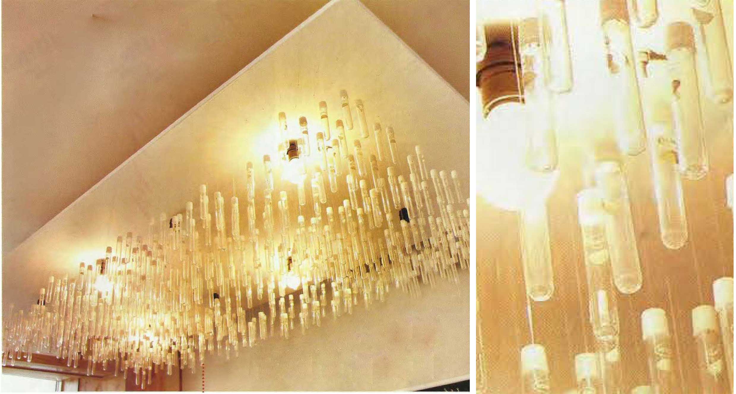 To make the ceiling not look plain, this idea could be an alternative. Hundreds of chemical test tubes are hung randomly between the light bulbs so that they look like chandeliers.