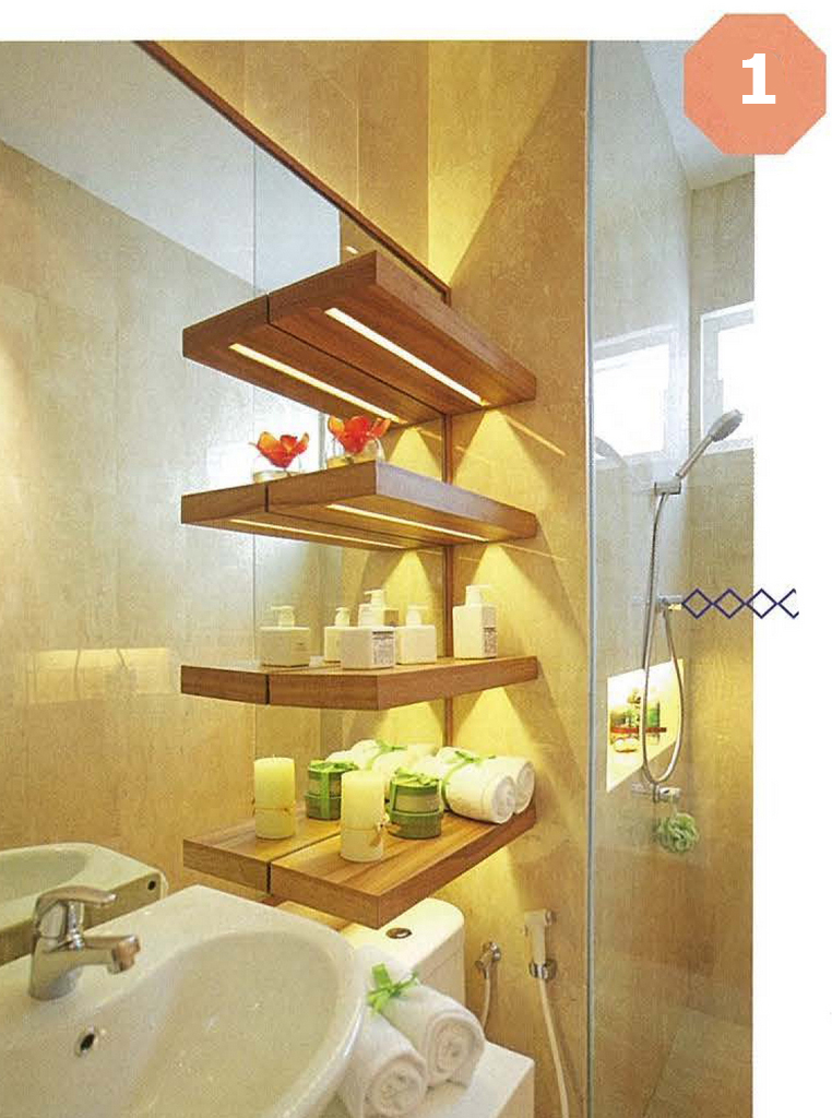 At first glance it looks like floating, the shelves are apparently attached to the mirror in the bathroom. This wood-textured shelf with HPL coating is located above the toilet and used to store various bathroom utensils such as bottles, towels, candles, and so on. To avoid damage, the shelves are placed in dry areas. Additional dim lighting is located on the underside of the shelves, so it will add a beautifully dramatic effect. This storage idea is certainly suitable to fill the modern-style bathroom at home.