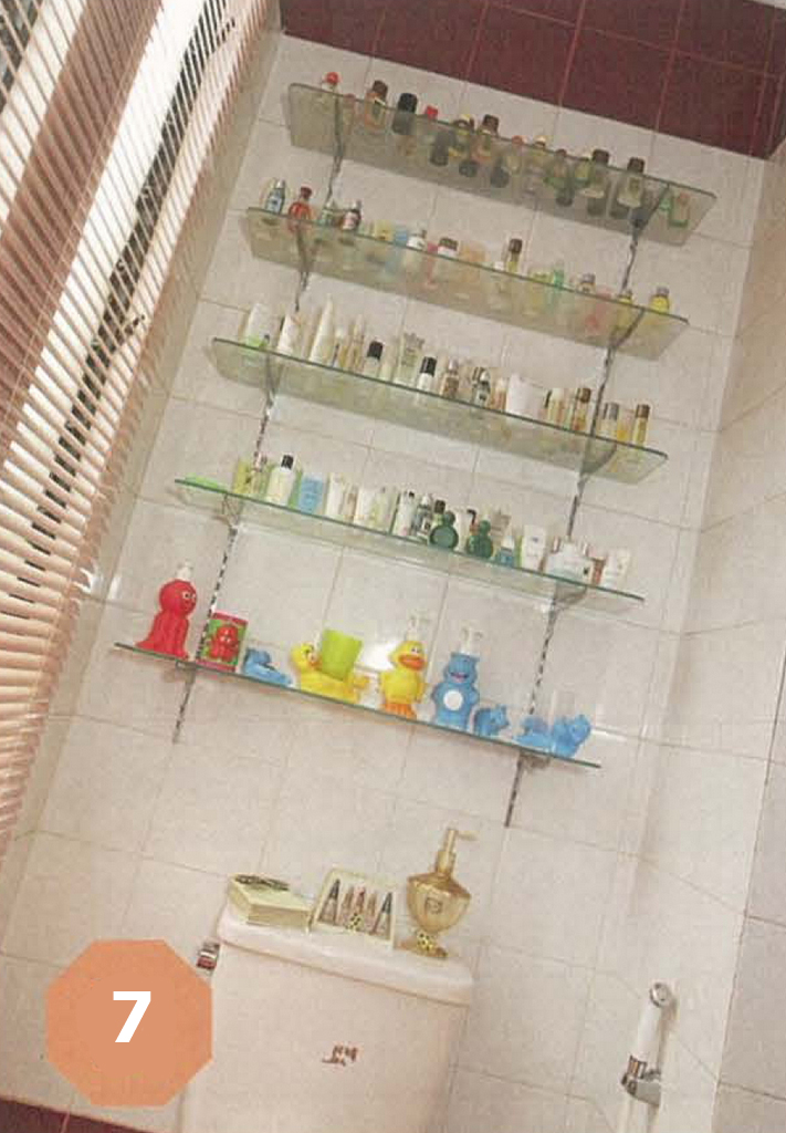The design of this bathroom puts a toilet on the front side of the bathroom door. When the bathroom door is opened, the view will go directly to the toilet. Want to block this view with something more interesting, then the homeowner creates a transparent partition made of steel as a frame and glass as his shelves.