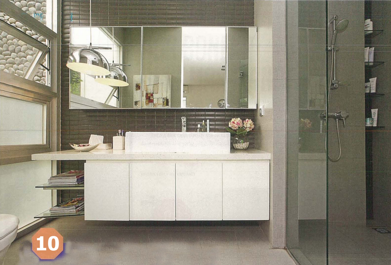The bathroom wall can be used as vertical storage for various toiletries. As in this bathroom, various shampoos, soaps, and moisturizers in bottles and tube with various shapes are collected and placed regularly on glass shelves.