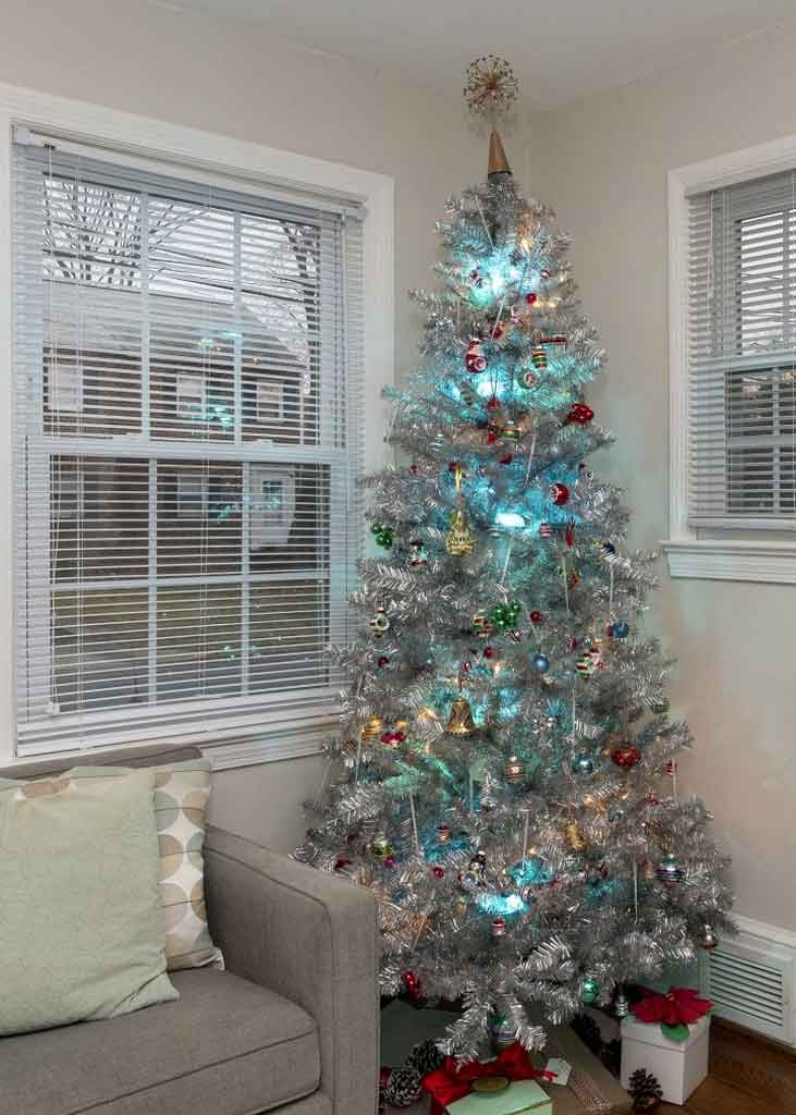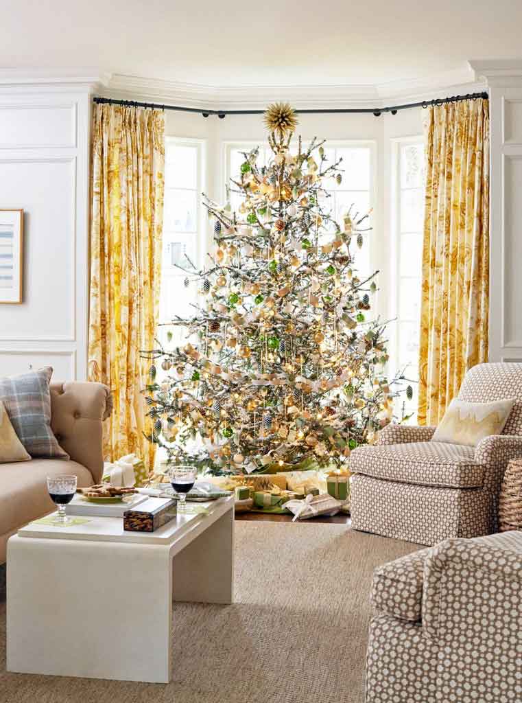 The next idea that you can choose is using a fresh off the tree farm. You can combine it with glowing pine dazzles with metallic baubles and DIY pinecone ornaments. Plus, add the star on the top of the tree with a craft paper star coated in gold leaf. Then, you can add chunky outdoor lights to give this woodsy Christmas tree theme an authentic look.