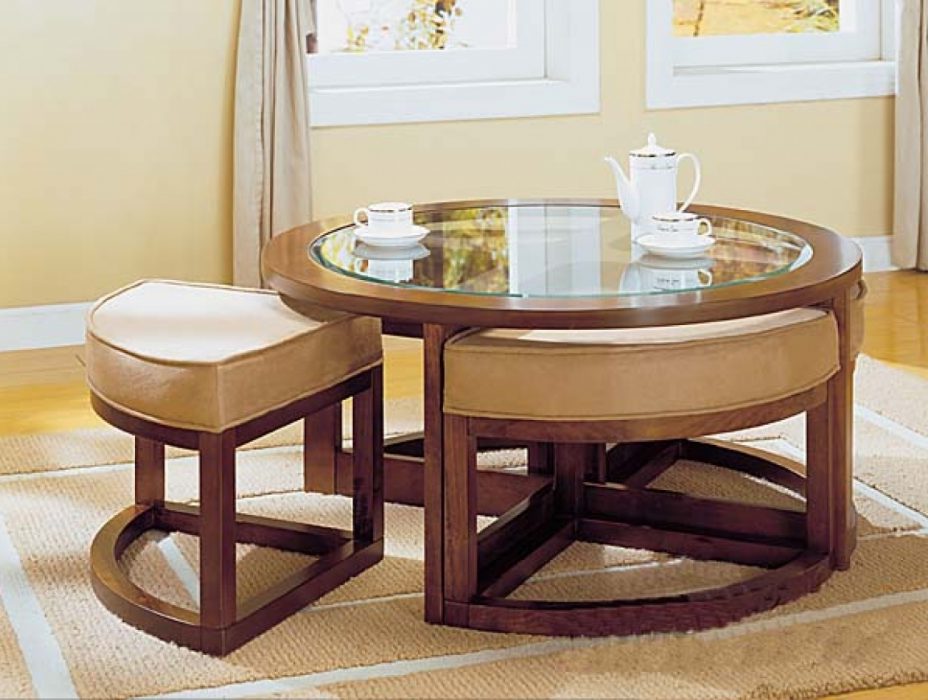 This is a superior quality glass coffee table with stools underneath manufactured from solid and ornamental lumber. Four spacious otomans provide additional storage space for different items. It really is ideal for any kind of room decoration and it’s got an operating design.