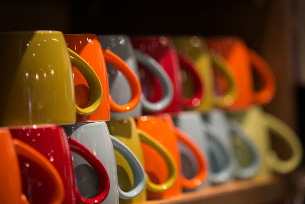 Add a variety of coffee-themed style to your country kitchen with coffee cups and beans stenciled wall border. Then, choose a matte tone to apply the paint. Don’t forget to use a sponge to blend the border in with the rest of the coffee theme kitchen decor. Handmade coffee cups in an array of colors scattered around the shelf’s kitchen can add some color and texture to the room.