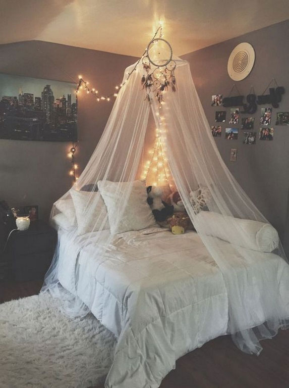 Soft and simple, this canopy bed idea is inspired by a charming forest fairy. You can make it by hanging a thin white curtain panel from the flower arrangement. You can hang it from the ceiling with a subtle cable that is almost invisible. Then, attach the wreath to the metal as the sustenance to create this bed tent canopy.