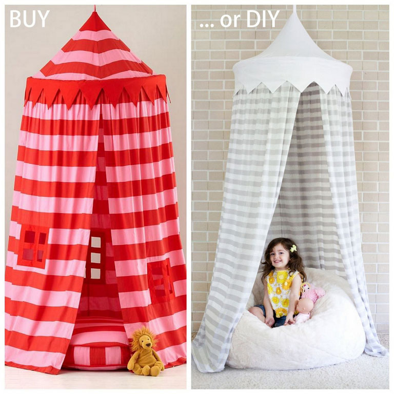 This cute canopy is easy for anyone to make. All you need are a few materials, such as a large embroidered circle, decorative edging, three panels of sheer curtain. Next, sew each panel together and insert the finished canopy into the embroidery hoop. When you’ve put it all together, attach an embroidered circle to the ceiling or hang it over the bed.