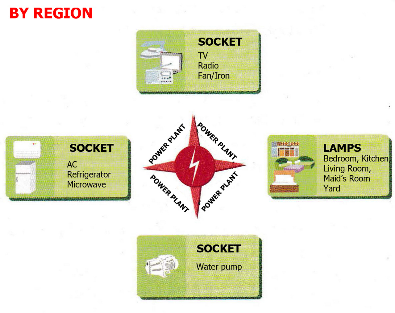 The distribution of electricity groups based by region is more efficient in cable usage compared to electricity load (lamp load, socket load, electronic equipment load with large wattage requirements)
