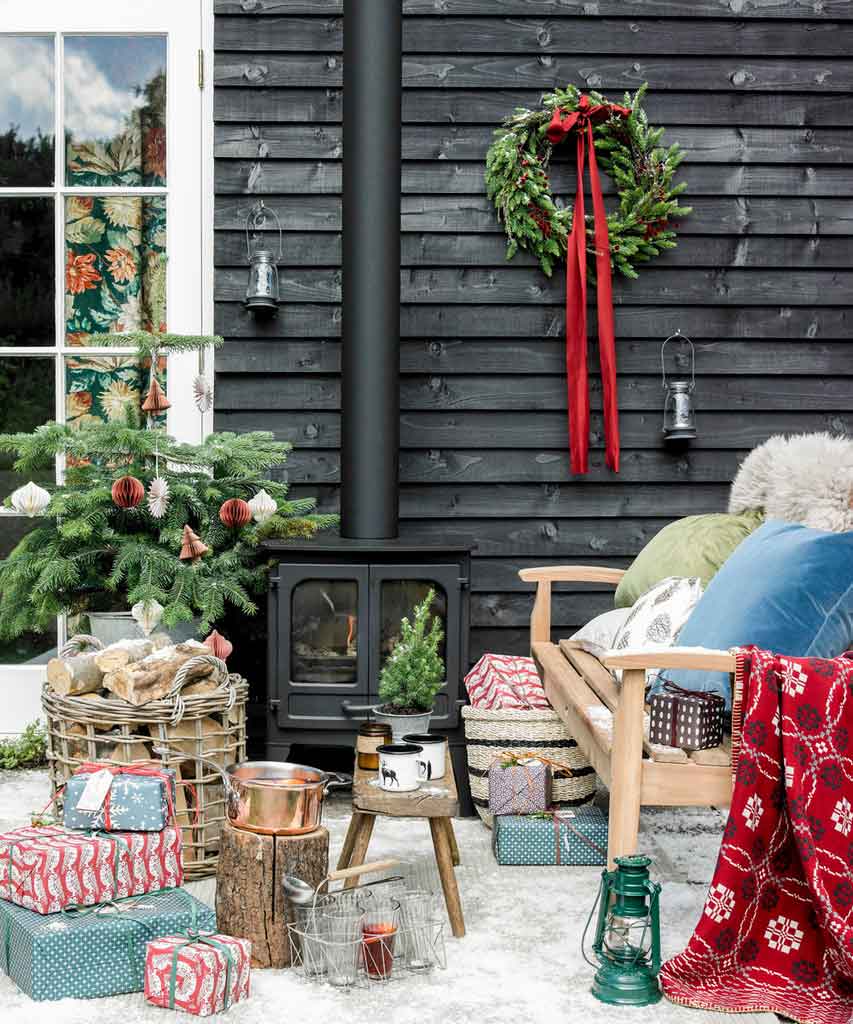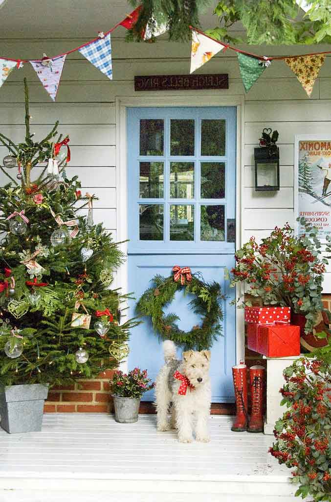 You are free to express your creativity. While Christmas is also known for its glam and fun, but you can decorate with simple materials to make it works. Any green with branches will bring a natural touch. The skirts are easy to find and reusable. DIY, boxes, and candies will be the way to make your porch full of your personal touch. Good luck!