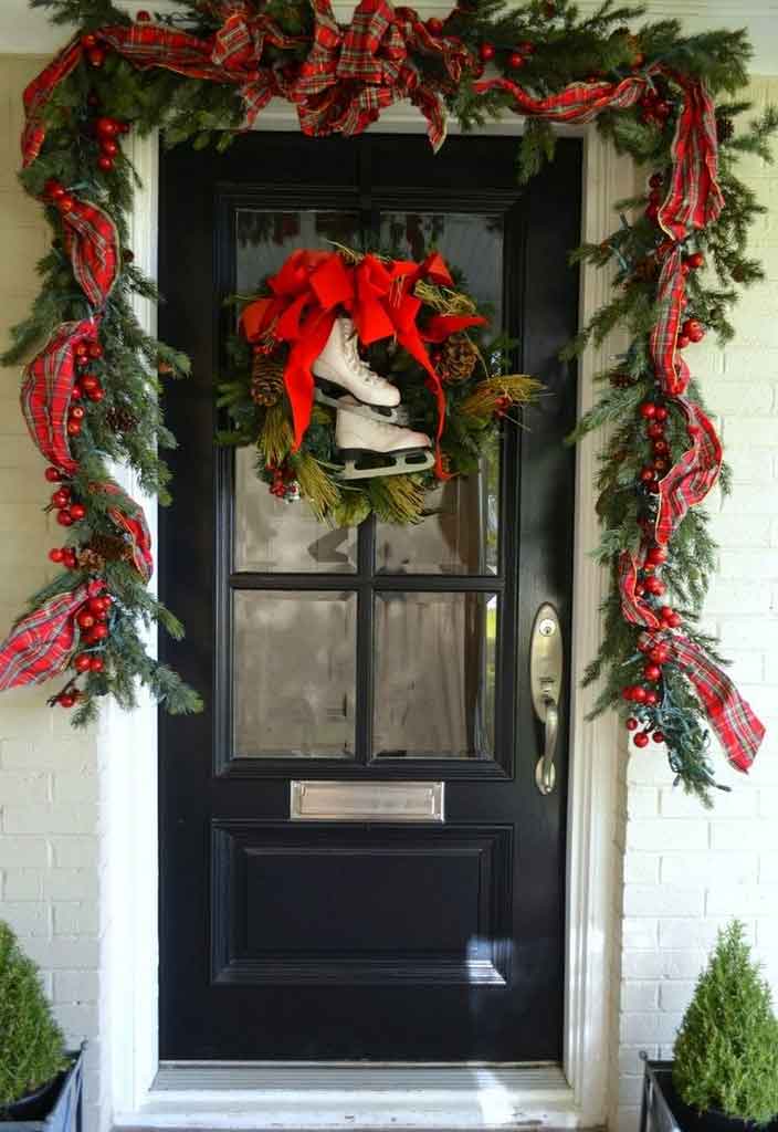 How if the winter snow wouldn’t leave you with any greens? Then get the branches. Wood is very easy to find and versatile for decorating prop. All you need is collecting some cool looking twigs, wrap it with pretty ribbons, and use them as Christmas front door decorations. You can also put them on a woven basket next to the doormats.
