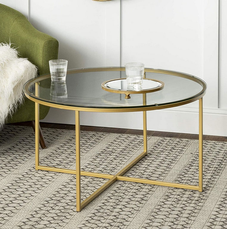 In case you are looking for a coffee table that stands out, check out this style. A very cool piece of this furniture combines two small table surfaces into a single frame. It has three tops placed at slightly different heights. Then, it is attached to a triangle-shaped tripod base with the glasses tabletop. The design makes a sense of diversity without visually over in the room.