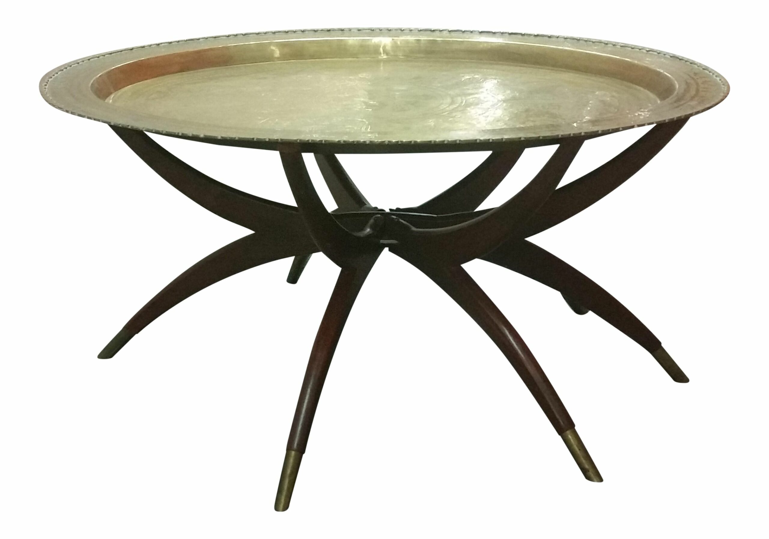 Beautiful etched brass charger top moroccan coffee table round Heavy brass with profound scalloped, crimped ends. Original light shades on real wood spider platform with brass ft . tips. Piece actions approx 48″ long x 30″ vast x 17 1/2″ large. No designers stamp or tags.
