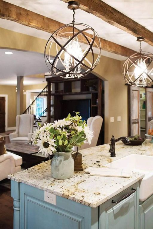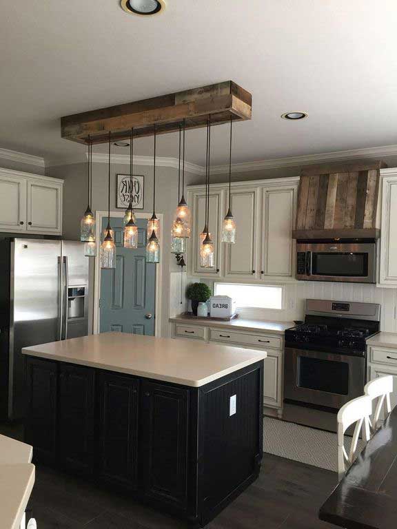 In a farmhouse update to track lighting, this light fixture has hanging Mason jars with warm superb bulbs secret. Hanging at flexible heights, the uplighters have a casual look. The lamps hang from a rustic firewood fixture in keeping with farmhouse style. These lights would look outstanding and brilliant over the island in any kitchen model.