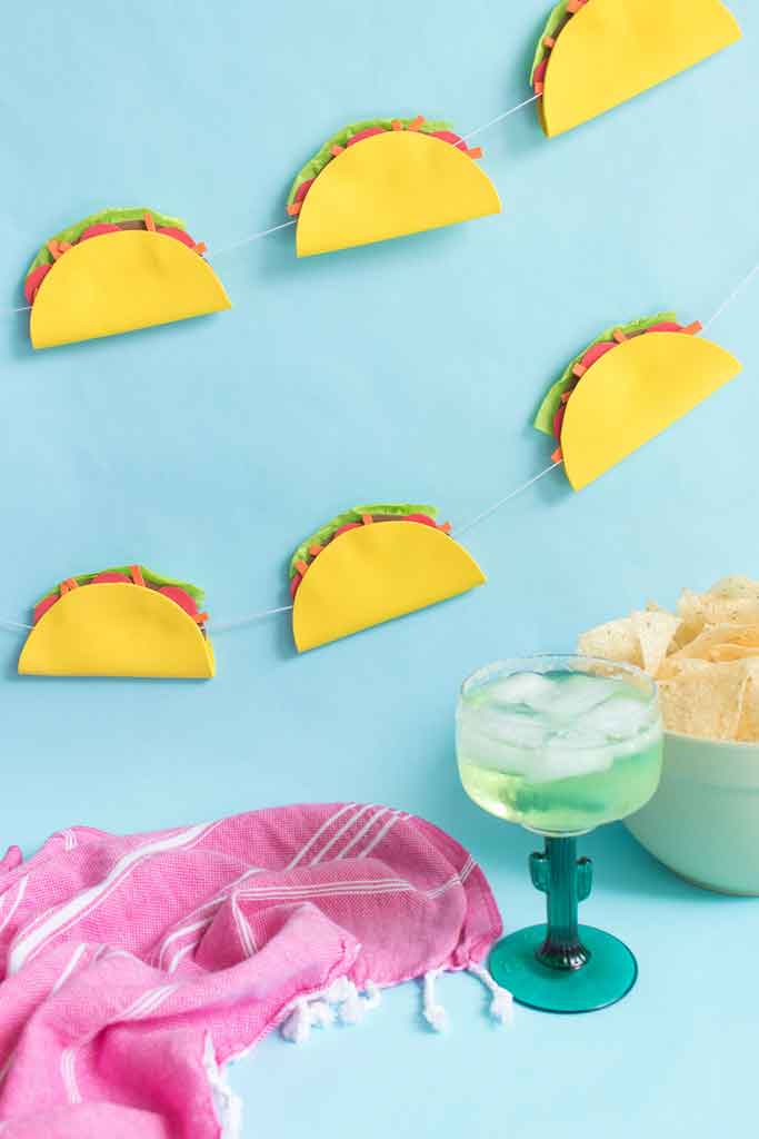 Go ahead and snuggle the DIY decorations with pillow cactus. It is soft and the perfect fun accent that you can sew to place in your living room. The cactus is made by sewing green fabric together, then following the simple pattern. For further enhancement, you can add white yarn to form the cactus needles. The completed pillow will make a great addition to your Mexican themed party decorations.