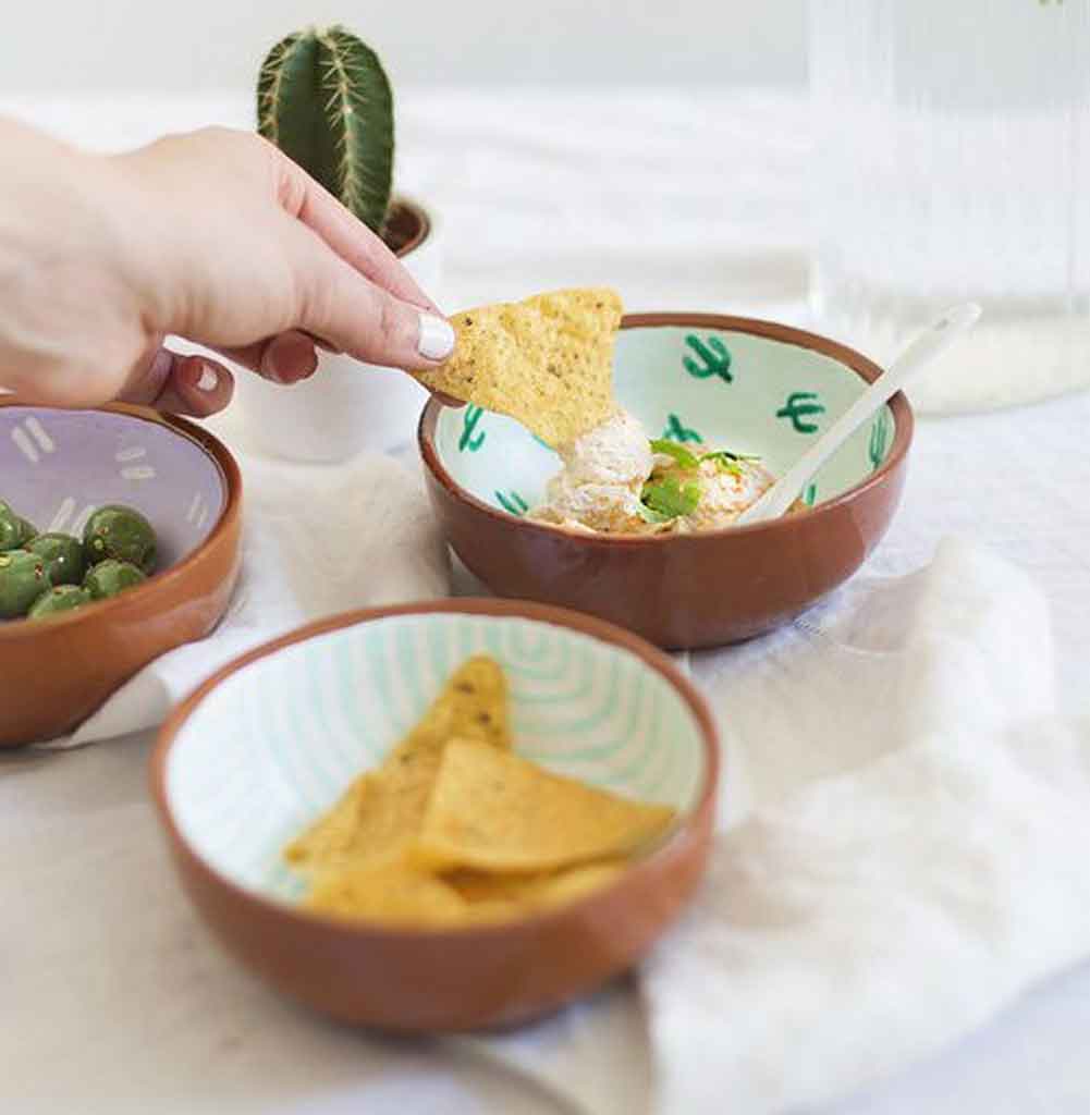 Serve up corn nacho chips and a little spicy salsa at home by making your own set of hands. You can paint the patterned bowl by painting terra cotta bowls or creme brûlée dishes with porcelain paint. To give the final touch, create the cacti style or geometric design in the bowl. Once painted, make sure to bake the dishes and go with food-safe clear shellac before bowls to serve food.